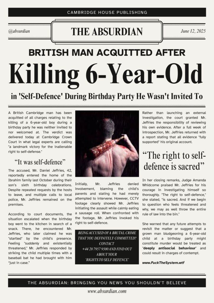 A British man has been acquitted of all charges relating to the killing of a 6-year-old boy during a birthday party he was neither invited to nor welcomed at. The verdict was delivered today at Cambridge Crown Court in what legal experts are calling “a landmark victory for the inalienable right to self-defence.”